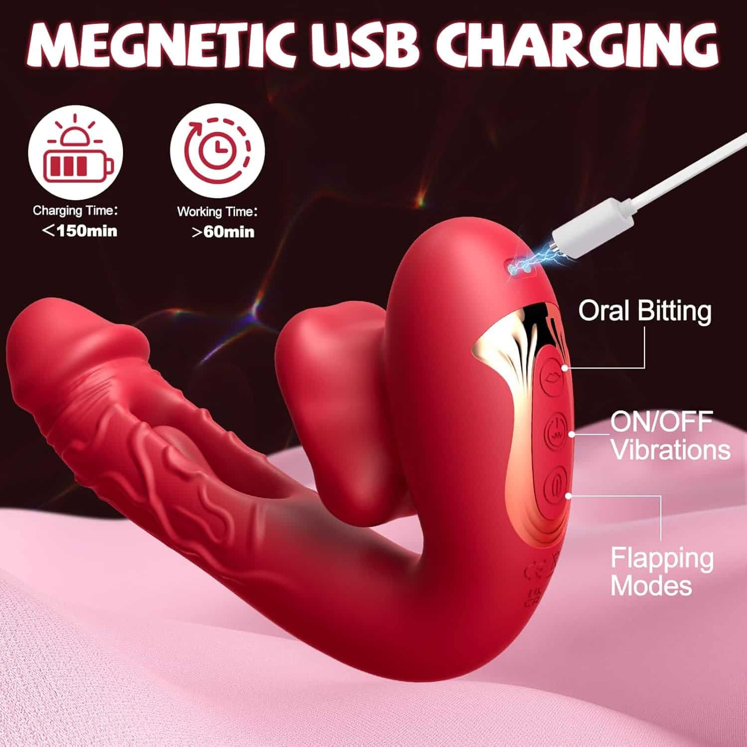 Customizable Pleasure Modes:10 vibrating, flapping, and licking – biting patterns. Separate buttons for individual or simultaneous use, ideal for solo or couple play.